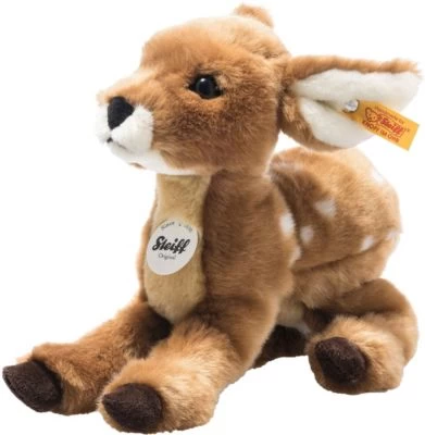 Romy Rehkitz ist super niedlich und aus kuschelweichem Plüsch in hübschen Farben gefertigt. Vom rötlichbraunen Grundton abgesetzt, präsentieren sich Brust und Bauch in Beige. Mundpartie, Kinn und Innenohren sind in Weiß gehalten. Die weißen Kitzflecken werden per Airbrush Stück für Stück sorgfältig platziert. Romys Augen sind groß, Nase und Mund in Schwarz gestickt. Zierliche, dunkelbraune Hufe schließen seine langen Läufe ab. Und die benutzt es sehr gerne!