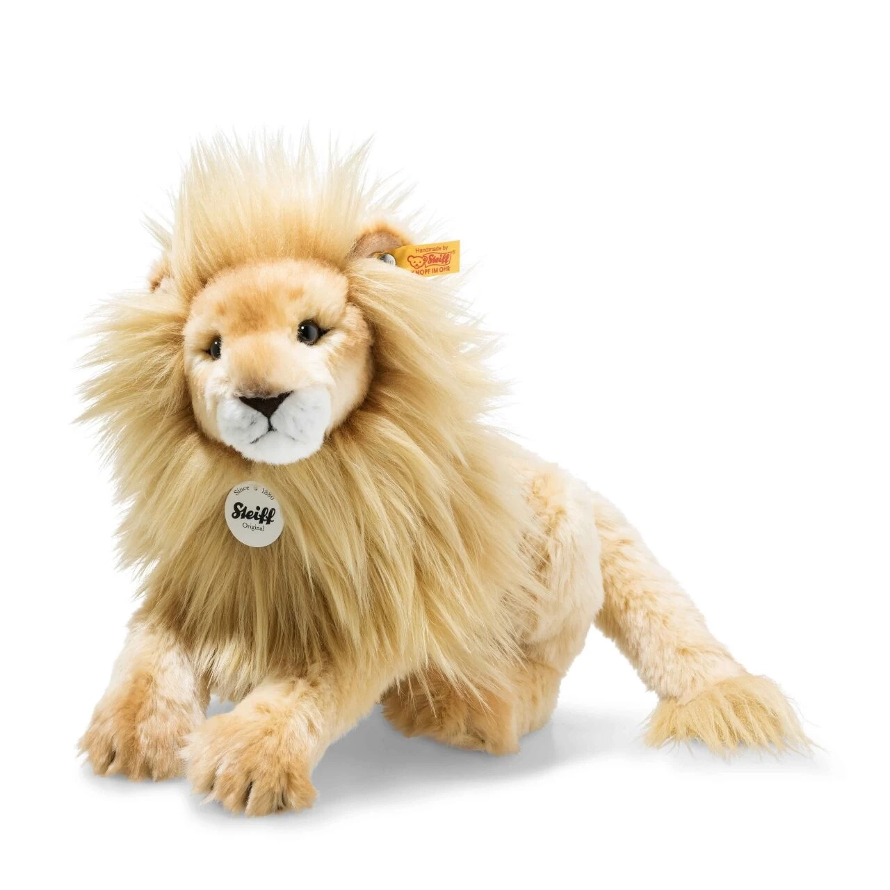 Der König der Tiere ist nicht nur als besonders stark bekannt. Leo Löwe ist auch sehr hübsch anzusehen. Er ist 30 cm groß und ruht sich jetzt liegend von der Jagd aus. Seine lange Mähne verleiht ihm den mächtigen Eindruck, den es braucht, um als Beschützer der Familie gelten zu können. Der blonde Leo ist aus kuschelweichem Plüsch gefertigt. Um den Mund herum ist Leo weiß, und die Nase ist in dunkelbraun gehalten. Der Mund und die Bartstoppeln wurden ebenso wie die Krallen mit Airbrushtechnik gestaltet. Die Innenohren und die Fußsohlen sind in beigem Plüsch gefertigt. Wie jeder perfekte Löwe hat auch er eine schöne buschige Rutenspitze. Mit einer hellbraunen Bemalung sind die Augen genau wie die Ränder seiner Ohren versehen. Über der Nase und auf der Oberseite der Pfoten zeigt sich wie auch vom Rücken bis hin zur Rutenspitze eine hellbraune Schattierung. Leo ist eben ein besonders schöner Löwe.