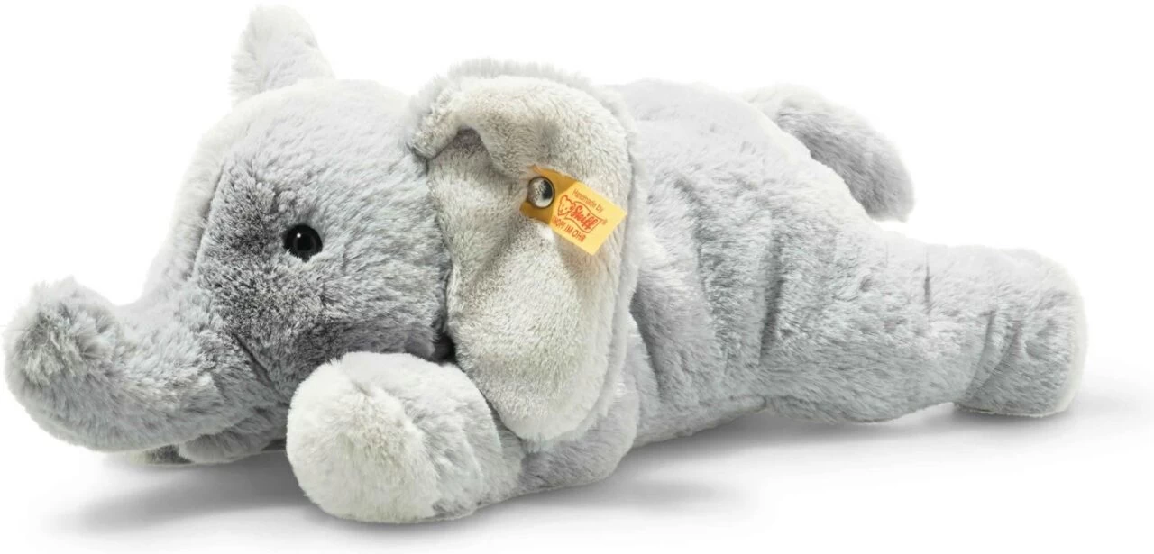 Die 28 cm große Elna Elefant aus der Familie der Steiff Soft Cuddly Friends besitzt große, weiße Ohren – natürlich mit „Knopf im Ohr“ – und weiße Pfoten, dazu einen gemütlichen Elefantenkörper mit Granulatsäckchen und den typischen Falten aus kuschelweichem hellgrauem Plüsch. Ihren Rüssel trägt Elna aufwartend, sanft nach oben geschwungen, ihren naturgetreuen Mund hat sie leicht geöffnet, die schwarzen Augen scheinen zu lächeln. Elna Elefant ist eine Nachfolgerin des beliebten Steiff Schlenker-Elefanten.