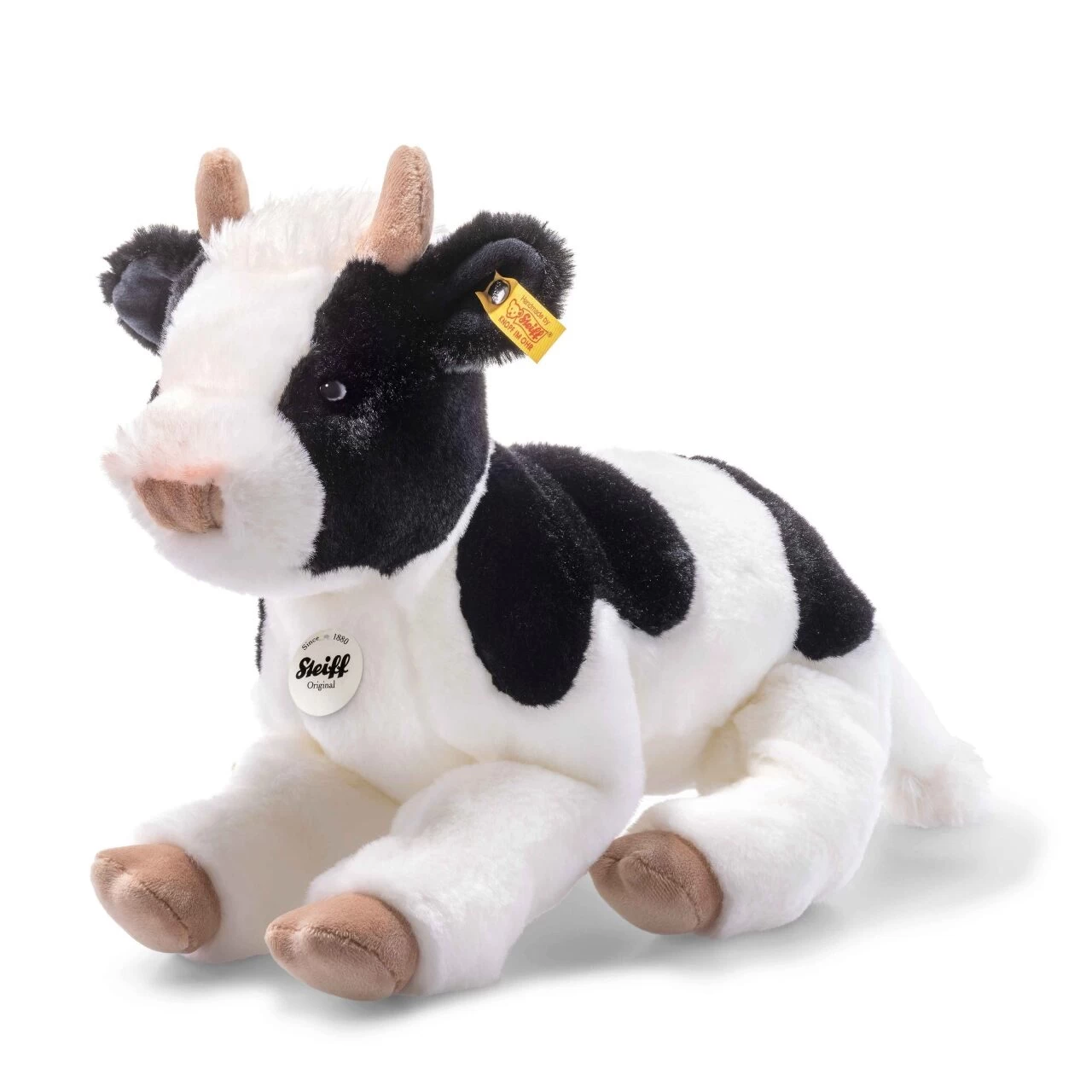 Über den ganzen Bauernhof ist Luise gelaufen, um die Eltern und Geschwister zu finden. Jetzt hat sich das Kälbchen erst einmal zum Ausruhen hingelegt. Immerhin ist Luise schon 32 cm groß und ihr kuschelweiches Fell aus schwarzweiß gehaltenem Plüsch sieht schon aus wie das der Eltern. Die Hufe und die Fußsohlen sind beige. Ebenso die Nase und die Hörner. Auf ihre typische Frisur aus längerem cremefarbenen Plüsch ist Luise sehr stolz. Ein Büschelchen davon und eine zusätzliche rosa Schattierung ziert das Gesicht oberhalb der Nase. So ist sie genauso hübsch wie der Rest der Familie. Nur eben viel niedlicher. Wenn sie sich ausgeruht hat und jede Menge Streicheleinheiten bekommen hat, wird sie sicher wieder gerne spielen und vielleicht auch ein wenig Unsinn machen. Sie ist ja noch jung und wer so aussieht, dem verzeiht man doch vieles.