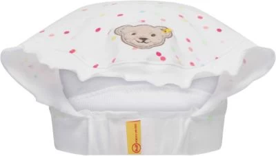 Mit Aufschlag begleitet dieses leichte Kopftuch, getragen wie ein Stirnband, zu den schönsten Unternehmungen und schützt das Köpfchen vor kühlen Winden und direktem Sonnenlicht. Ein buntes Punktemuster auf schönem Weiß und Rüschen am Rande des Tuchs verleihen süßen Retro-Charme und wollen zu Spiel, Spaß und den ersten Partys ausgeführt werden. Für alle Fälle hält ein flauschiges Steiff Teddybärmotiv die Augen für Ihre Kleine mit offen.
