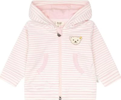 Mit dieser Jacke mit praktischer Kapuze geht es gemütlich gewärmt aus dem Haus. Für ein perfektes Tragegefühl sorgt das weiche Futter der klassischen Sweatjacke. Die lockere Passform schenkt aktiven Babys Bewegungsfreiheit. Mit Reissverschluss lässt sich die Kapuzenjacke sicher schließen. Trendiges Rosé passt als Farbtupfer in den Alltag wie auch zu festlichen Anlässen. Ein flauschiges Steiff Teddybärmotiv begleitet Ihre Kleine durch den Tag. Mit Kuschelfaktor!