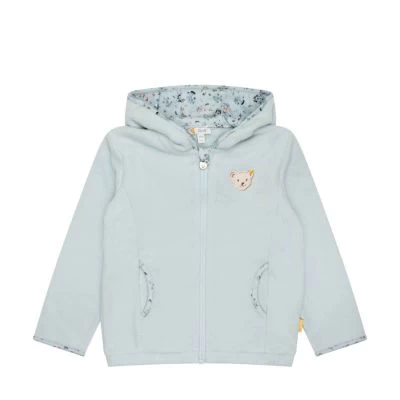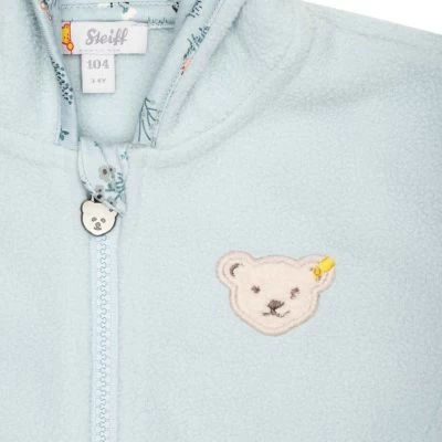 Wenn es draußen kälter wird, begeistert unsere Fleecejacke mit großer Kapuze als gemütlicher Wärmespender. Weicher Microfleece verwöhnt zarte Haut und bietet ein herrliches Tragefühl. Lässige Passform und flexible Bündchen bieten Bewegungsfreiheit zum Spielen und Toben. In den Seitentaschen finden kalte Hände ein Plätzchen. Edles Hellblau ist ein zeitloser Klassiker und wird im Alltag oder zu besonderen Anlässen kombiniert. Für alle Fälle wird Ihre Kleine von einem flauschigen Steiff Teddybärmotiv durch den Tag begleitet. Perfektes Basic!