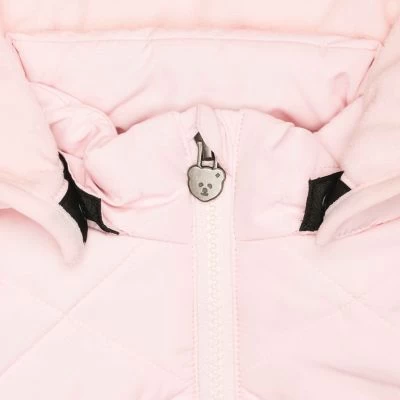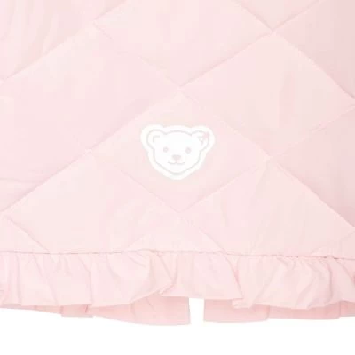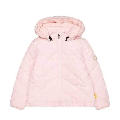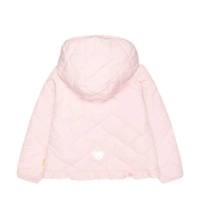 Der Allrounder für jede Witterung, ob drüber oder drunter: Die leichte Rauten-Steppjacke mit Stehkragen und abnehmbarer Kapuze in Rosa und kleinen Volants am Saum ist chic und niedlich zugleich und ein angenehmer Wärmespender für kühlere Tage.