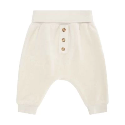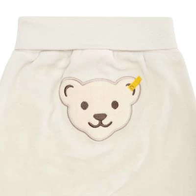 Die Jogginghose aus samtigem Organic Velour ist ein Wärmespender mit Kuschelfaktor. Lockere Passform und Schlupfbund schenken aktiven Kindern viel Bewegungsfreiheit. Ein niedriger Schritt sowie flexible Bündchen am Beinabschluss lassen eine besonders niedliche Silhouette entstehen. Helles Grau wird mit einem gemusterten Body im Handumdrehen zum Wohlfühl-Look gestylt. Mit einem flauschigen Steiff Teddybärmotiv auf dem Rückteil ausgestattet, sind leichte Stürze beim Laufen lernen gar nicht mehr so schlimm. Die Hose ist aus Bio-Baumwolle gefertigt.