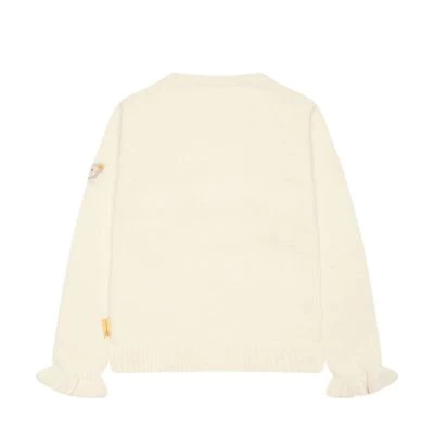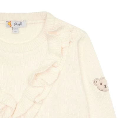 Edles Design macht unseren gestrickten Pullover aus. Pflegeleichter Baumwollstrick bietet ein herrliches Tragegefühl und wärmt mit feinem Kuschelfaktor. Flexible Bündchen laden zum Reinschlüpfen und Wohlfühlen ein. Die Unifarben mit Rüschen vorne und am Ärmelabschluss verleihen klassischen Chic, ob auf Festen oder unterwegs in der Stadt. Außerdem wird Ihre Kleine von einem flauschigen Steiff Teddybärmotiv auf dem Arm überallhin begleitet. Mit Wohlfühlgarantie!